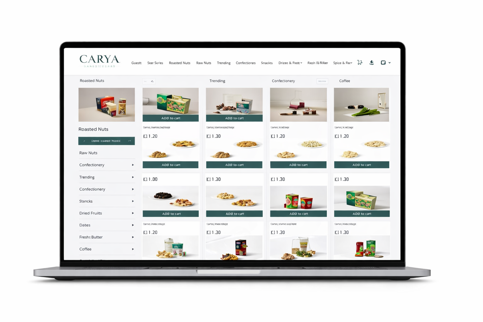 Users can easily browse a wide range of products including roasted nuts, coffee, snacks, and more, with clear product displays and seamless add-to-cart functionality.
